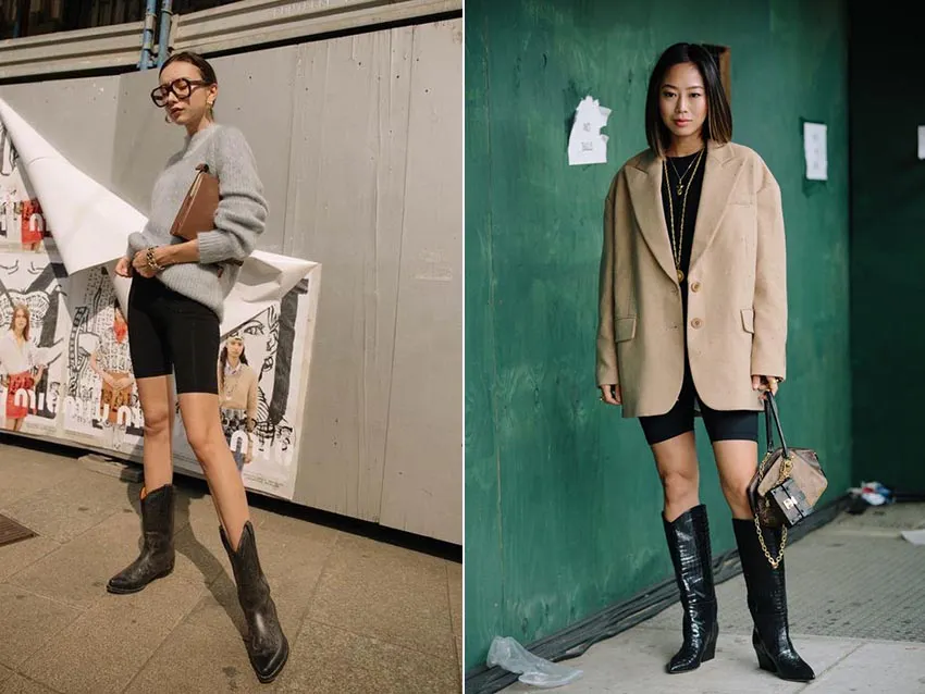 在潮人圈火成一片的單車褲,除了搭球鞋、無論搭什麼鞋都怪,但潮人發現牛仔靴就是解套好方法。時尚博主Aimee Song就以Oversize西外搭配單車褲,下搭長筒牛仔靴(右),成功打造都會潮女風格;身形纖瘦的女孩也可以嘗試寬大男友毛衣搭單車褲,一雙短筒牛仔靴立刻打亮造型。