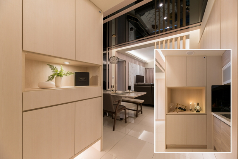 1.為讓空間大幅利用,玄關處採雙面櫃設計,一面為玄關櫃,一面為廚房的收納櫃,使得隔間更為立體實用。