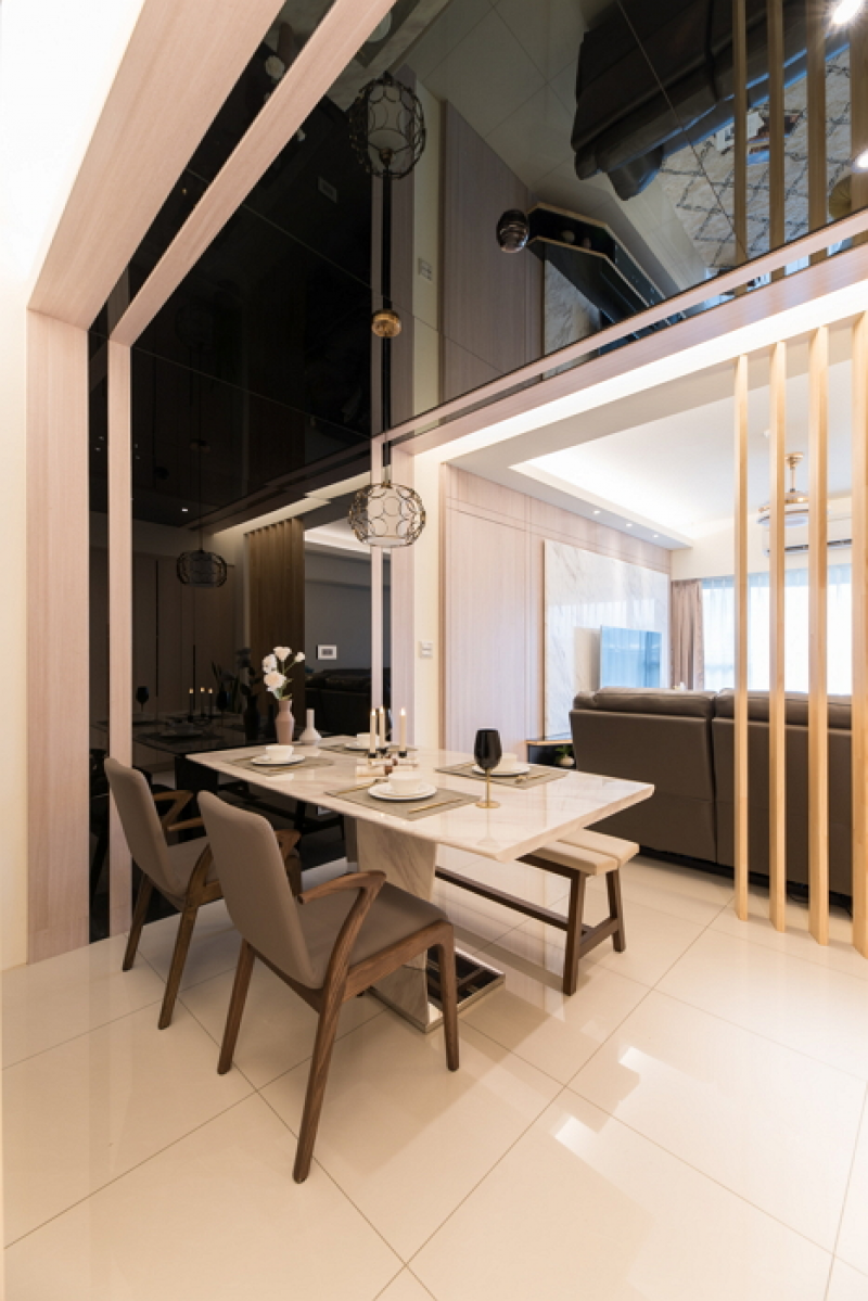 ▲餐廳區輔以黑玻與原木線板多層次搭配,創造出時尚流線氛圍。