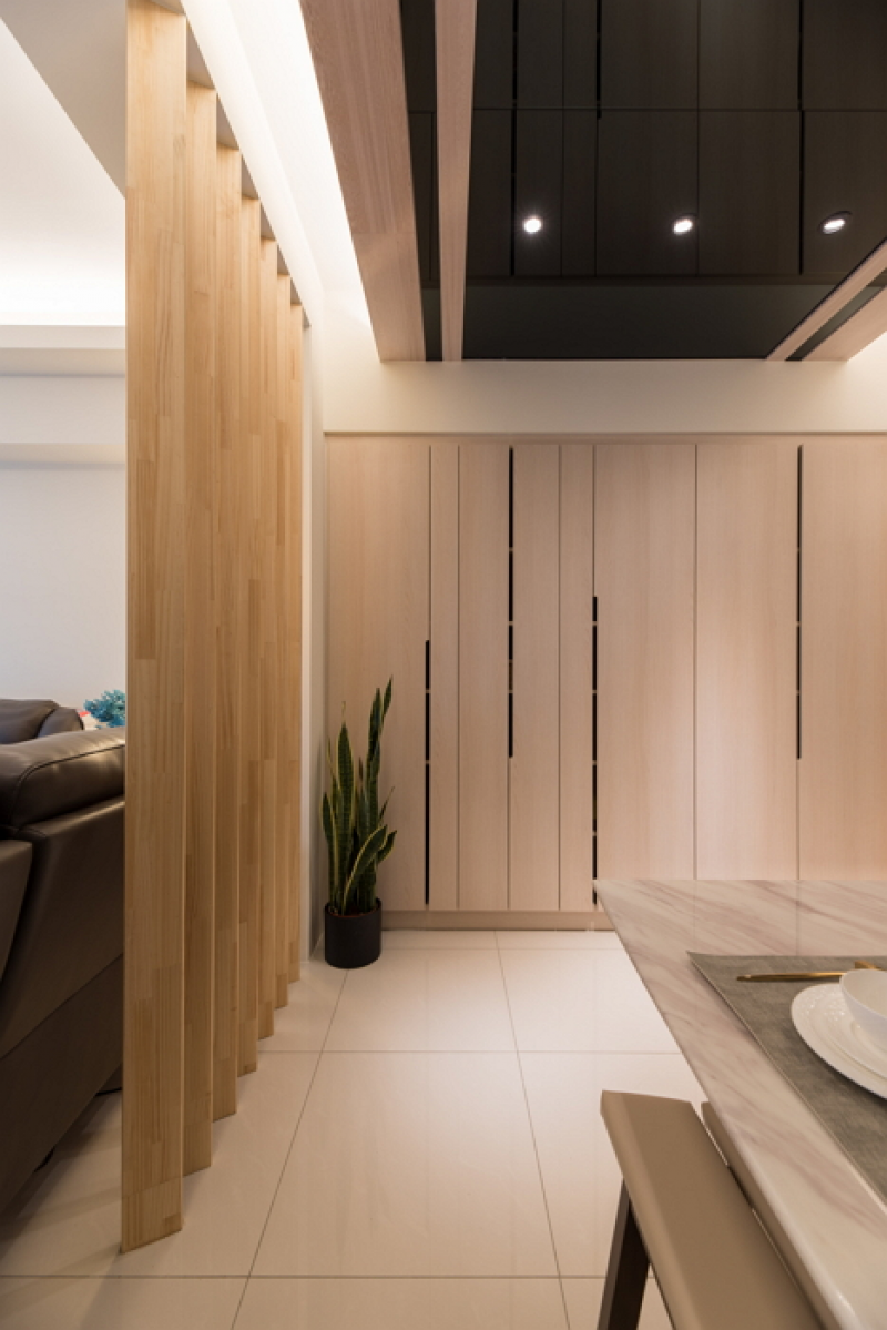 2.造型優美45度斜角擺置的實木橢圓格柵作為沙發的屏背,區隔出餐廳與客廳的場域劃分,且格柵寬度大於大門寬度,有效化解開門見廳的風水疑慮。