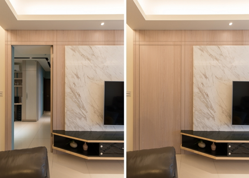 ▲進入臥室區廊道採隱藏式門片,與電視牆合為一體,大大延伸視覺感。