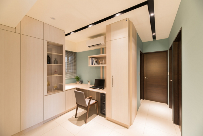 ▲書房天花板以黑色燈槽加上LED燈,增加亮度的同時也延伸該區L型的流線意象,配合湖水綠牆面油漆,讓書房整體的視覺造型有效連貫至臥室前的廊道。