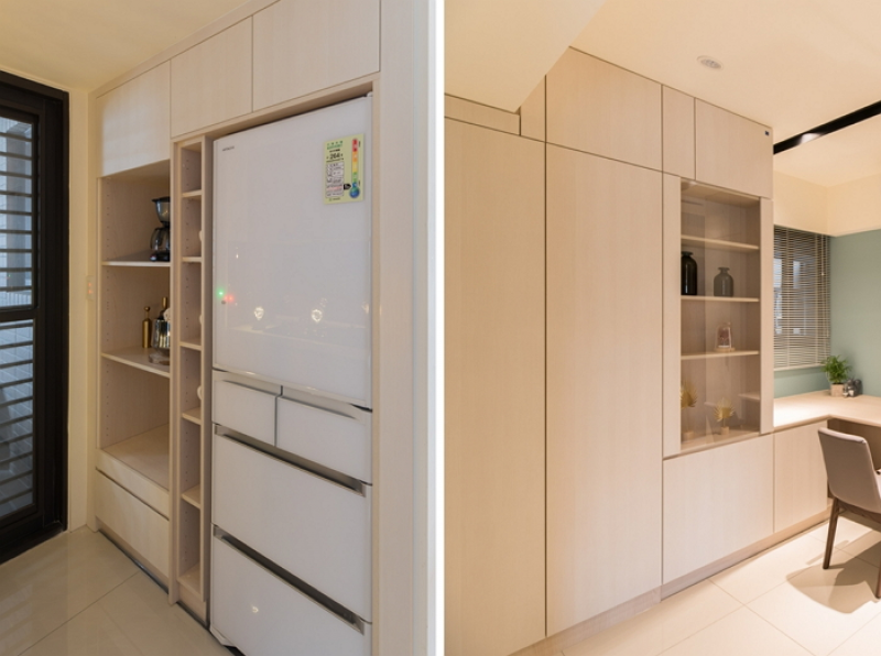 ▲玄關進門左邊原為新成屋擺放冰箱的位置,設計師為擴大使用坪效重新規劃雙面櫃,一面為中間鏤空置物小平台的鞋櫃,另面則為廚房的電器櫃(右下圖)。