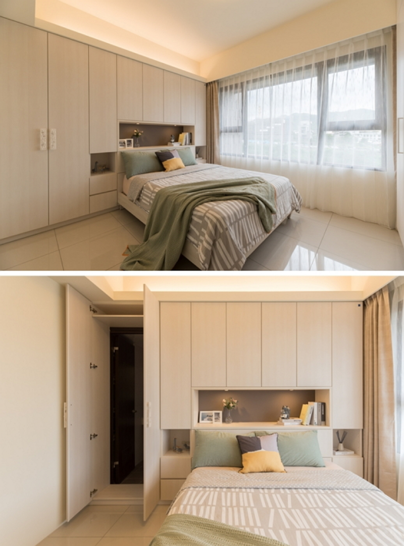 ▲放大主臥室的空間感,衛浴門片與床頭櫃連成一氣,看似簡潔俐落的系統櫃,其實左邊雙門片即為衛浴入口。