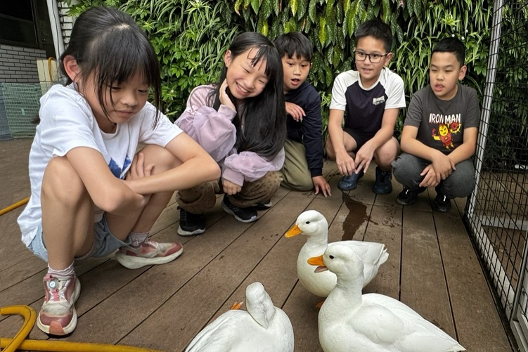 ▲八德區霄裡國小學生在校內照顧柯爾鴨,成為最好的生命教育。