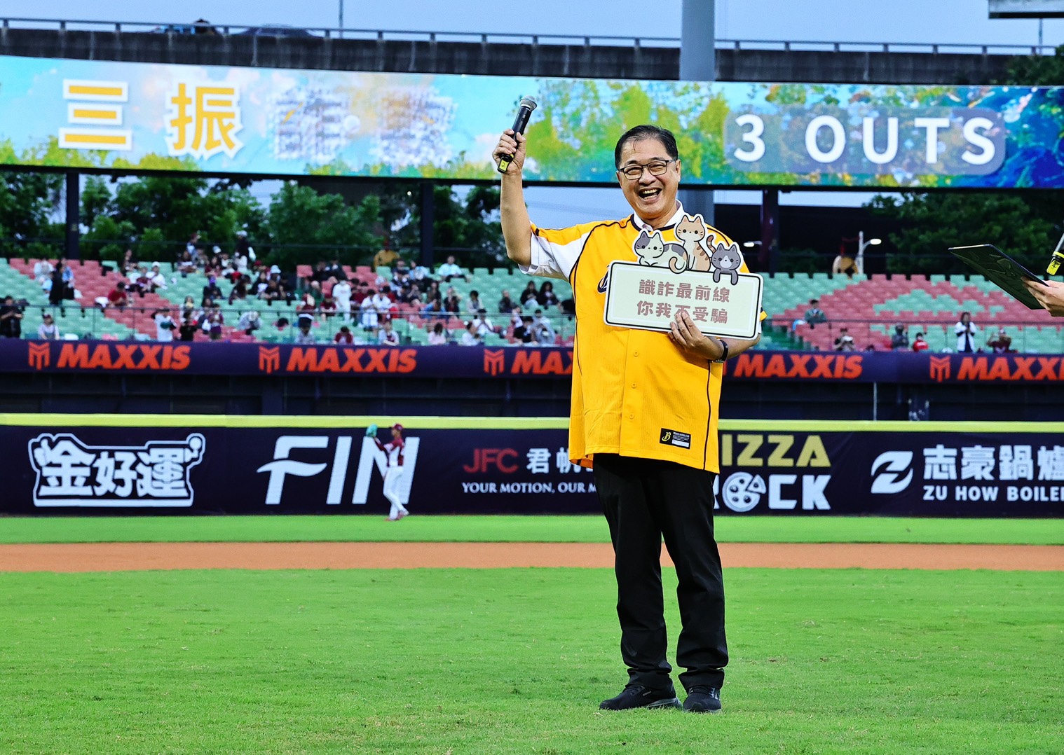 法務部長鄭銘謙以球迷身分到場,並以棒球術語鼓勵民眾防制犯罪。