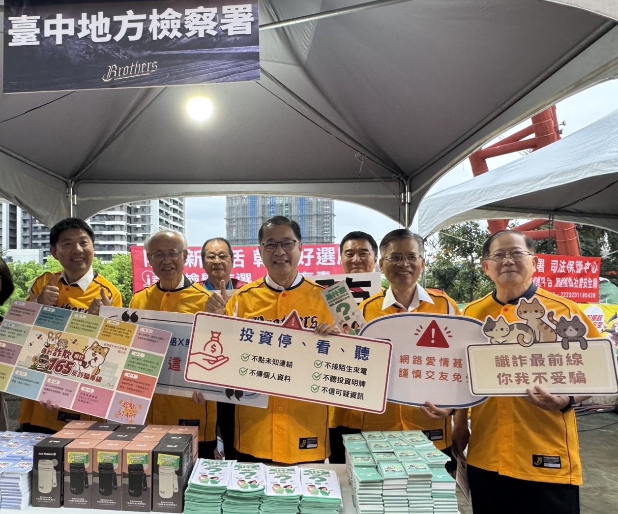 法務部結合台中市榮譽觀護人協會在場邊設攤,向民眾宣導防詐、防毒、反賄選知識。