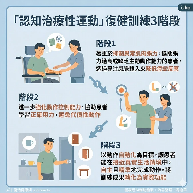 簡秀容指出,在臨床應用上,認知治療性運動依患者恢復狀況分為3個循序漸進的訓練階段: