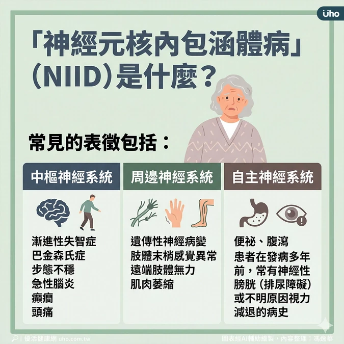 陳珮昀解釋,神經元核內包涵體病是一種慢性進展的退化疾病,臨床表現十分多變,影響的系統也很廣泛,常見的表徵包括: