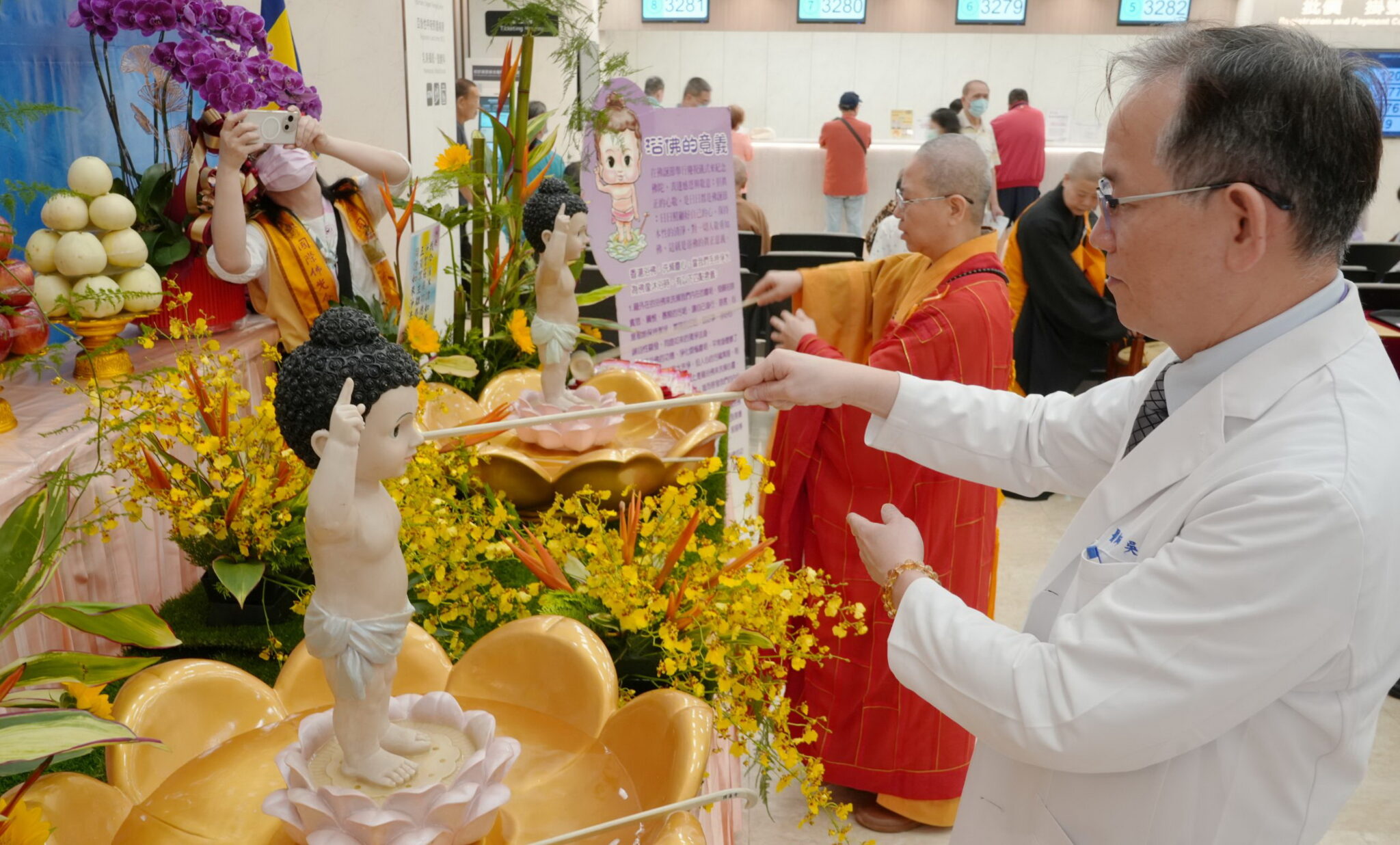 衛福部台北醫院舉辦浴佛祈福活動,邀請法師帶領醫護、病友及家屬一同祈願。