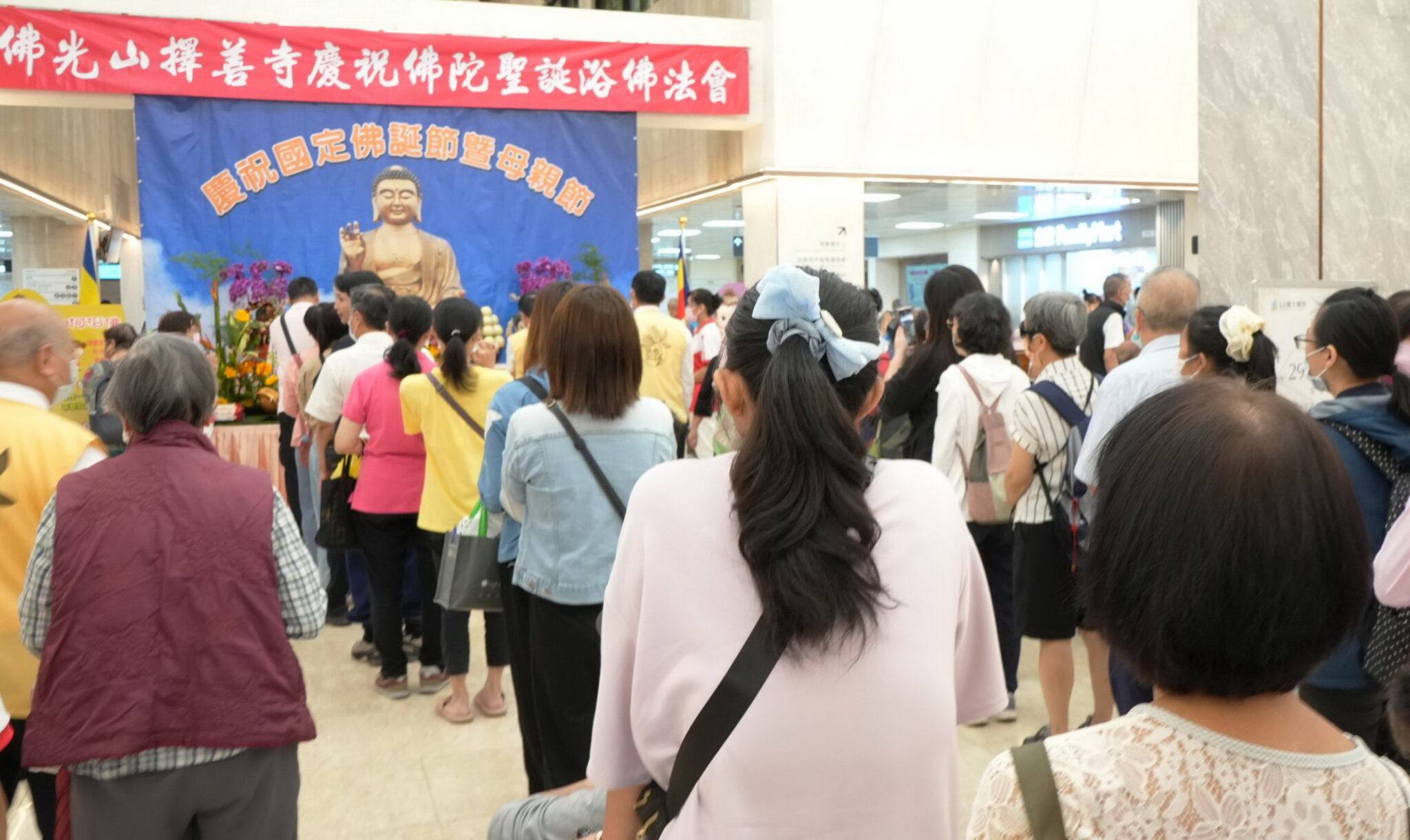 台北醫院廿九日上午舉辦浴佛祈福活動,在醫院一樓大廳設置莊嚴浴佛台,在清淨的佛號聲中,大家合掌祈願,並依序上前以淨水浴佛,象徵洗滌煩惱、淨化身心;有許多住院病人及行動不便的病友,在醫護與志工陪同下緩步走上前虔誠祈福。不少病友表示,在治療期間能參與浴佛儀式,讓心情變得平靜,也更有力量面對接下來的療程。
