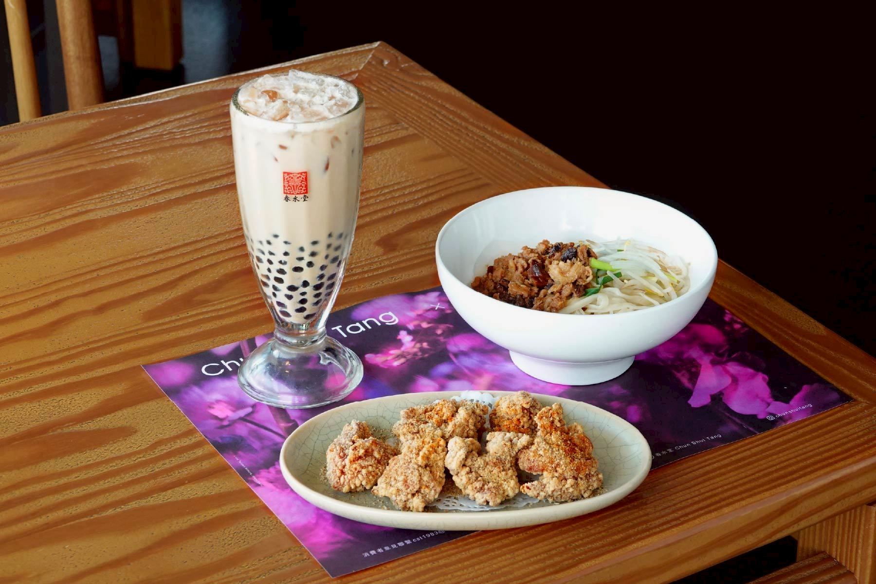 為了讓美學延伸至味蕾,春水堂特別規劃了四款期間限定的「花映套餐」。5月1日至6月30日間,消費者能以優惠價品嚐集結了珍珠奶茶、御品牛肉麵、功夫麵等經典餐點的絕佳組合。此外,品牌更推出了一系列值得收藏的聯名周邊,包含細緻的花卉玻璃杯組、質感綜合茶禮、購物袋以及實用的雙杯提袋,將原本侷限於空間的花藝元素,轉化為可以帶回家的生活藝術品。