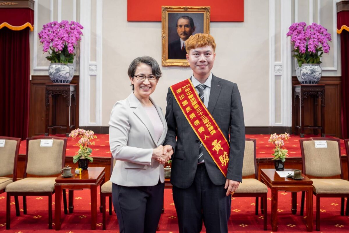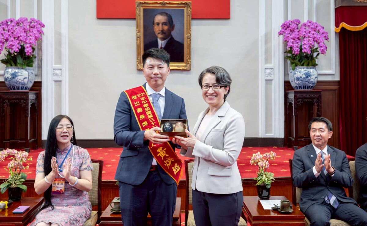 ▲黃煥超(左)上台接受副總統表揚並完成授獎儀式,象徵其在學前教育領域的專業成就與深耕成果。