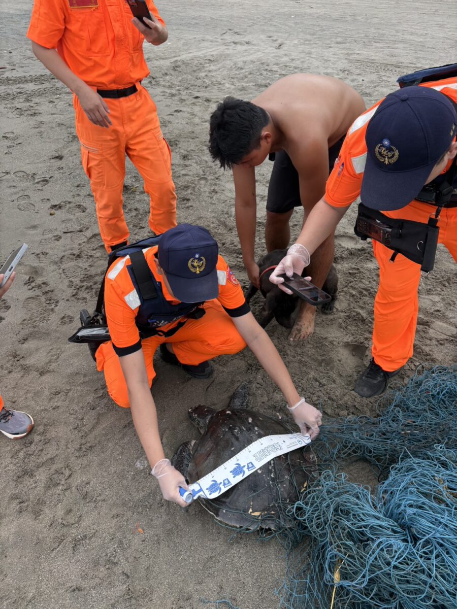 海岸巡邏員鄭又豪進一步說明,在海巡以及海保署保育員到場後,立即檢查海龜體型、健康狀況,研判是國内較少見的「欖蠵龜」,體型大約50公分,同時亦發現海龜後肢疑似遭魚網割傷,但活動力正常、尚可自行爬行,確認整體狀況穩定,無立即生命危險。後續依海洋保育救援流程評估,轉送至國立海洋生物博物館進行觀察與照護。