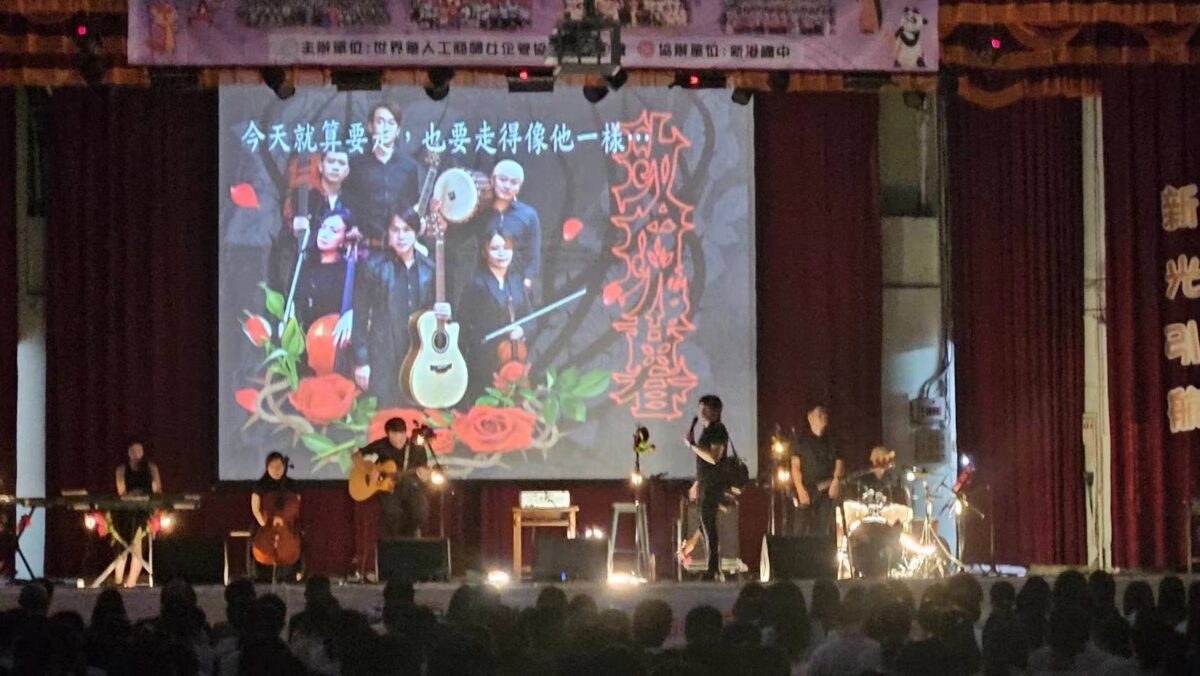圖:由世界華人工商婦女企管協會嘉義分會 主辦的玫瑰墓樂團「音愛生命一有生命的搖滾音樂會」,今(24)日下午在嘉義縣新港國中盛大登場,數百師生和地方各界人士参與這場特別的音樂會。活動透過熱血搖滾與真實生命故事的交織,為校園學子地方各界人士帶來一場深刻的生命教育洗禮。(記者吳瑞興攝)