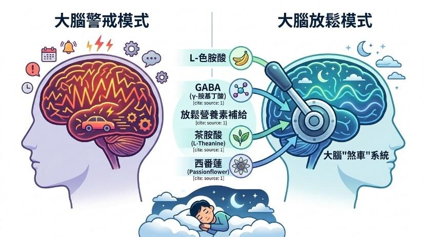 圖說:透過補充色胺酸、GABA、茶胺酸與西番蓮等關鍵成分,能為大腦提供充足的「煞車」原料,幫助順利進入休息狀態。