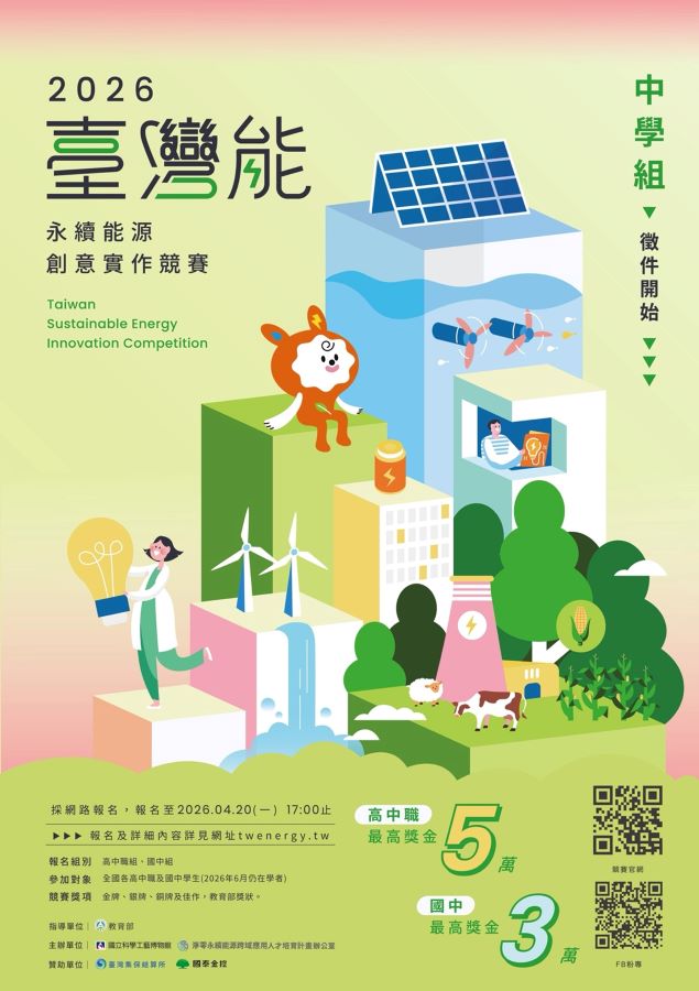 【記者 王雯玲/高雄 報導】由教育部指導,國立科學工藝博物館與淨零永續能源跨域應用人才培育辦公室共同主辦之「2026臺灣『能』—永續能源創意實作競賽」即日起開放報名中,誠摯邀請全國國中、高中職及大專校院學生踴躍參與,共同投入能源創新行動。