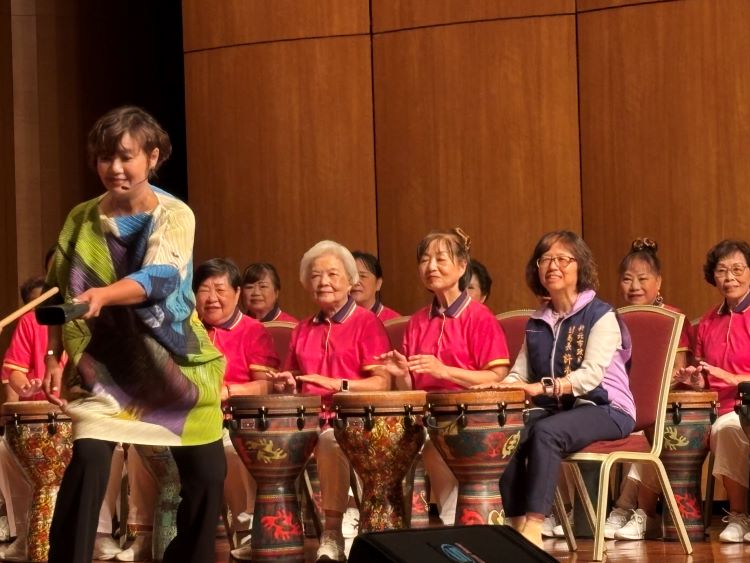 【記者葉柏成/新北報導】熟悉的〈高山青〉旋律響起,節奏層層堆疊,鼓聲如心跳般帶動全場氣氛。新北市蘆洲功學社銀髮俱樂部日前舉辦年度成果展,銀髮學員輪番登台,展現長期學習成果。台上表演者平均年齡75歲,其中最高齡95歲的阿嬤穩健敲擊墩杯鼓,神情專注、節奏分明;86歲阿公則熱情高歌,帶動全場氣氛,精彩演出贏得滿堂喝采。