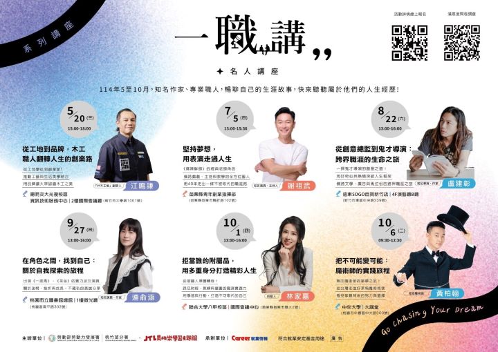 首場「一職講」講座於5月20日在陽明交通大學登場,邀請「什木工地」創辦人江鳴謙(木工阿彥),分享他從工地學徒到創立品牌的蛻變歷程,透過結合工藝與生活美學,翻轉大眾對傳統工匠的既定印象,展現職人精神的多元價值。第二場次將於7月5日於苗栗縣青年創業指揮部舉辦,邀請資深演員謝祖武,分享他在演藝產業近三十年的職涯歷程,從戲劇演出、節目主持到跨足教育領域,展現持續學習與多元轉型的職涯韌性。透過兩位傑出講者的職涯故事,協助青年從他人經驗中看到更多可能,並進一步思考未來職涯。