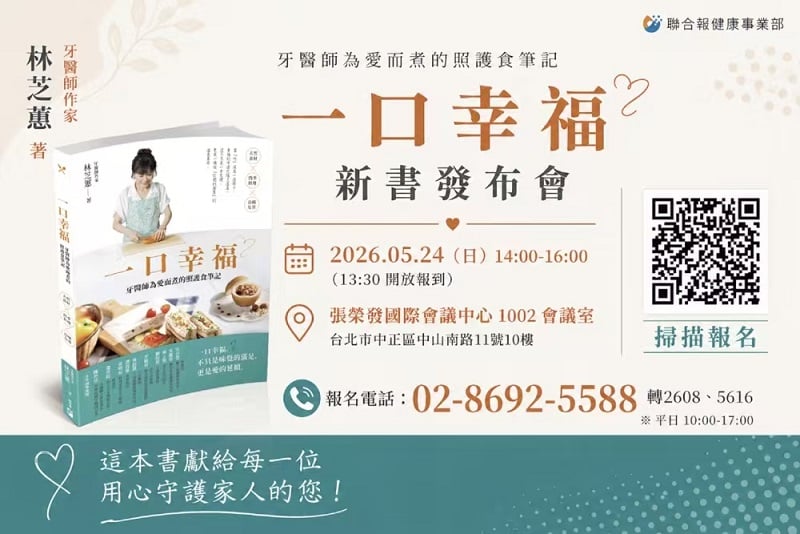 《一口幸福:牙醫師為愛而煮的照護食筆記》新書發表會,時間:5月24日(日)14時, 地點:張榮發國際會議中心1002會議室(台北市中山南路11號10樓),報名電話:02-8692-5588轉2608、5616 ,網路報名:https://forms.gle/6nRJ5Th3ykeaQ6ug8 ,(現場座位有限,請提早報名,以免向隅)。(圗/翔齡牙醫診所院長林芝蕙醫師提供)