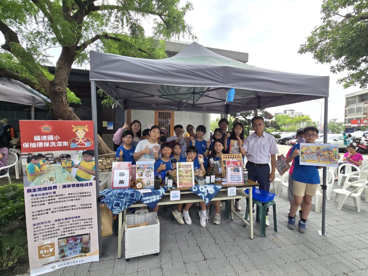永靖鄉福德國小師生參與奉茶,並推廣文創商品、永續食物及減塑生活理念。