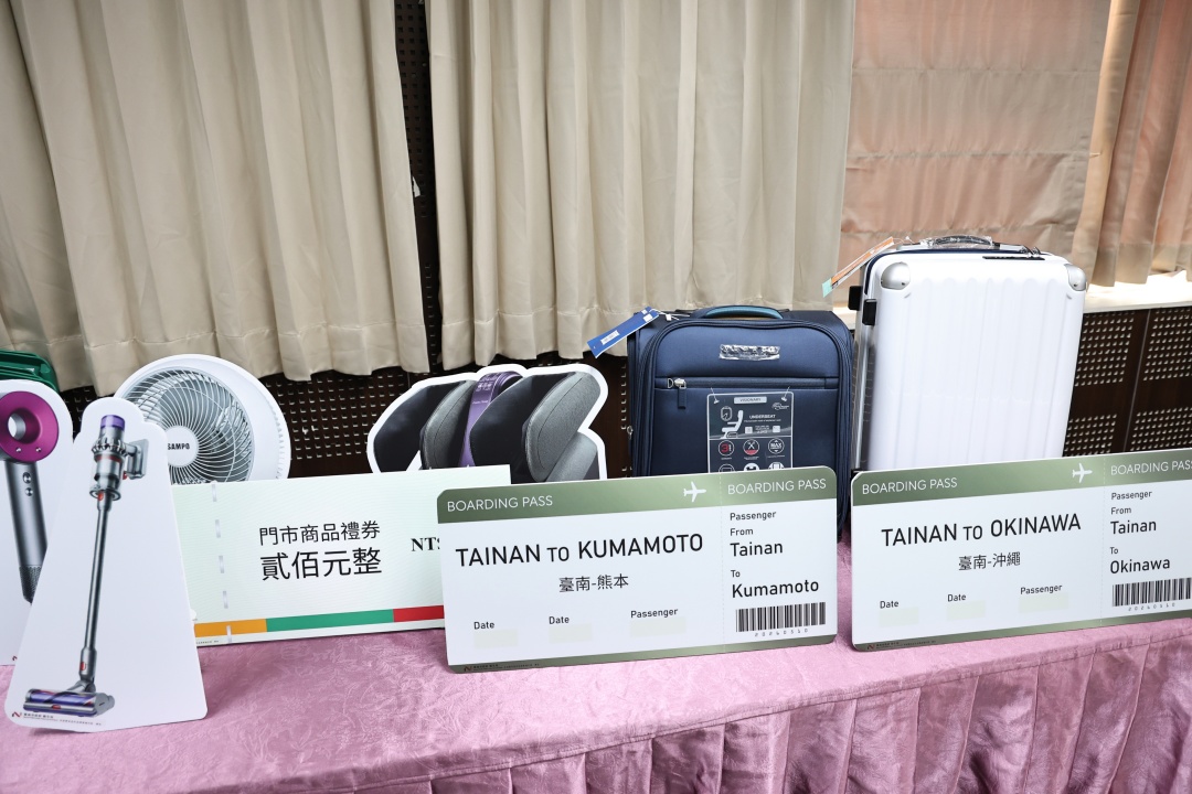 圖說:衛生局展示本次活動抽獎好禮,包括日本雙人來回機票及多項家電產品,吸引民眾關注與參與。(圖/台南市政府提供)