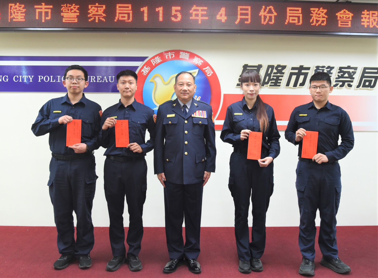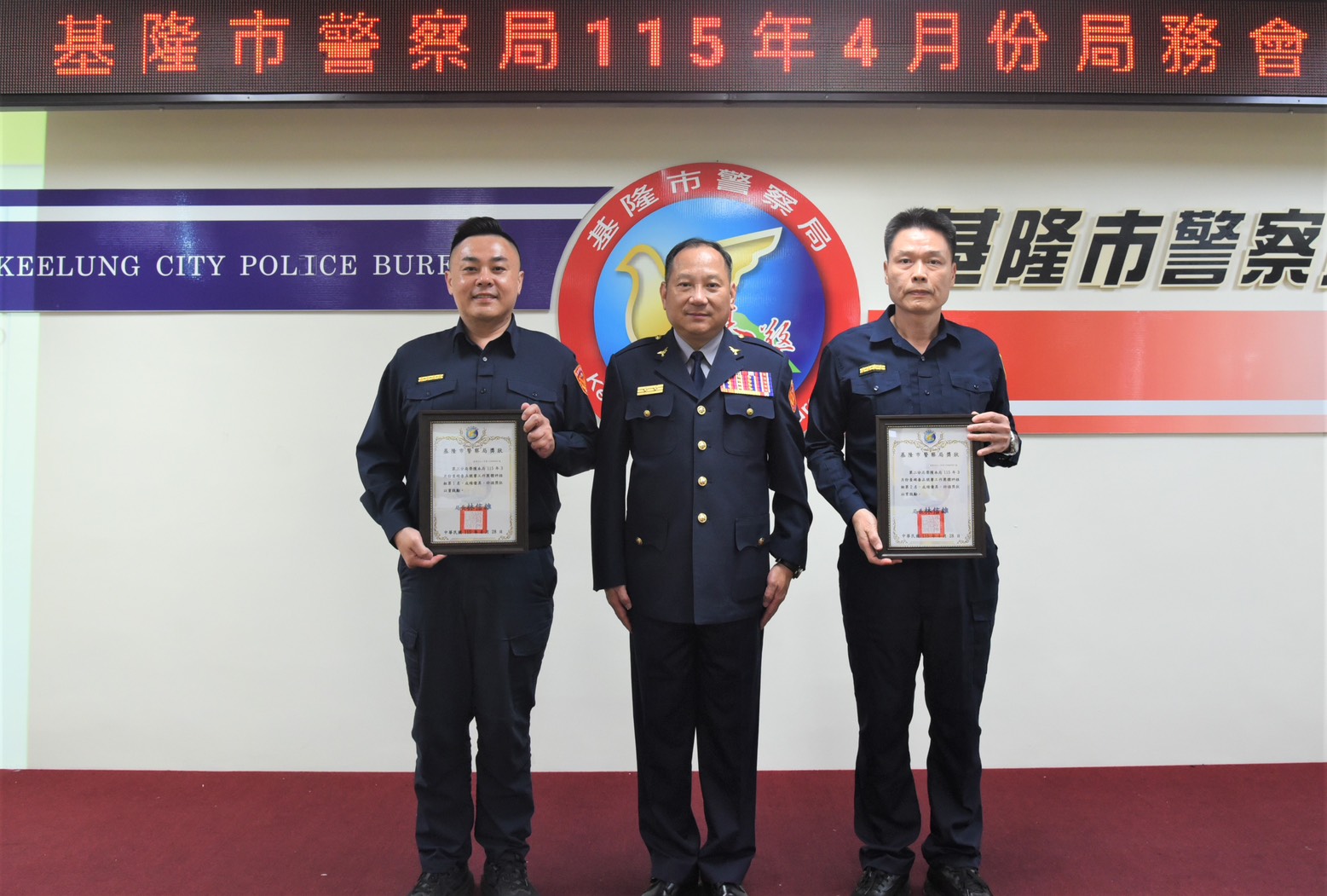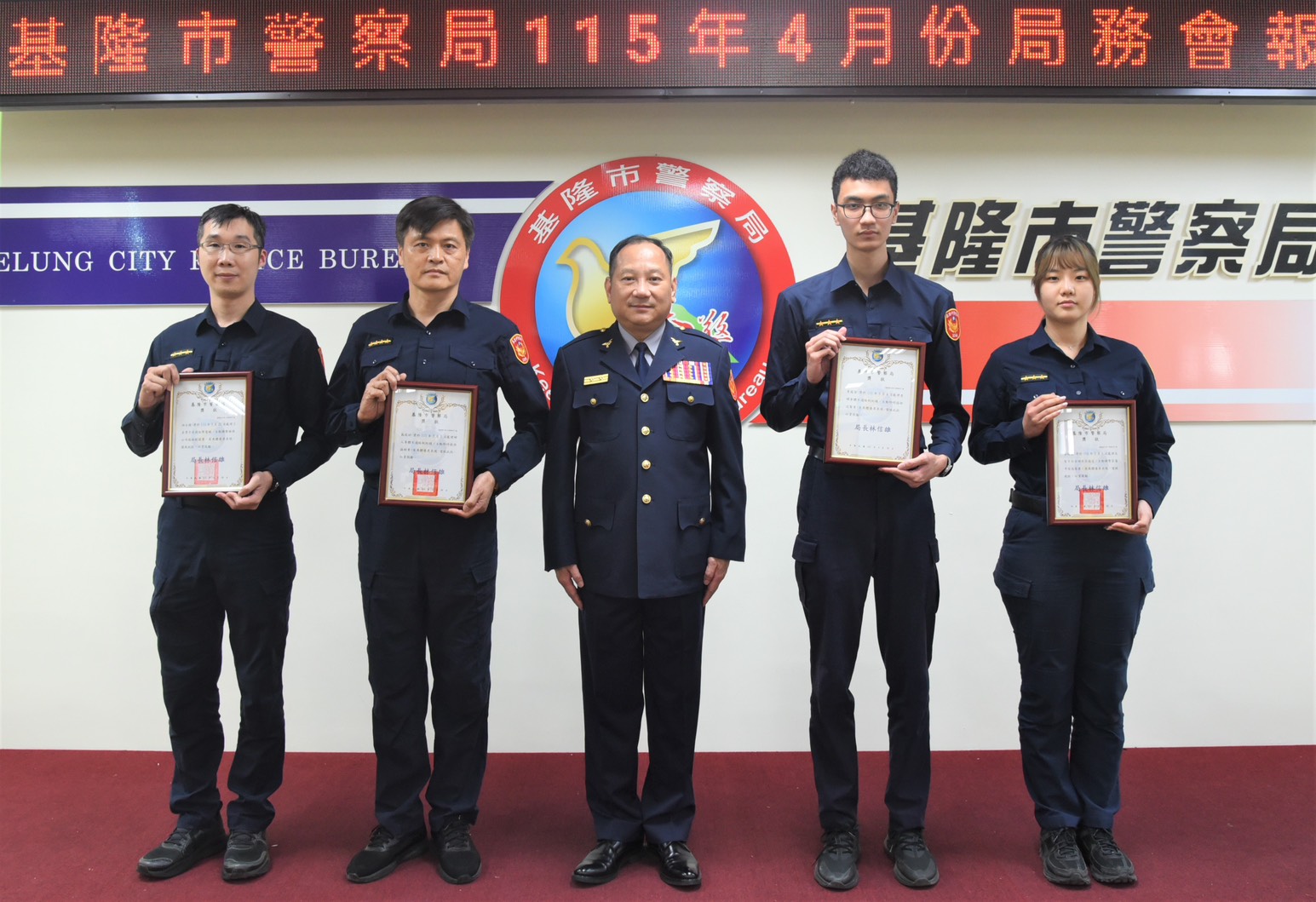 【民眾網編輯方笙楠基隆報導】基隆市警察局於4月28日召開局務會報,局長林信雄特於會前舉行授階及頒獎儀式,勗勉陞職與警政工作績優人員。