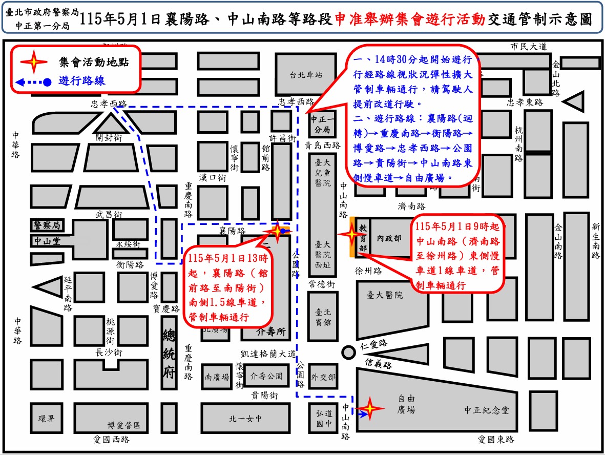 5月1日13時起,襄陽路(館前路【不含】至南陽街【不含】)南側1.5線車道,管制車輛通行,俟遊行隊伍整隊出發後即解除道路管制(視交通狀況提早或延後管制、開放)。
