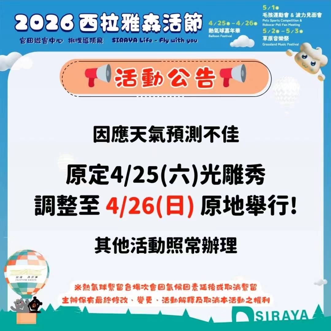 配合光雕秀改期,4月25日市集改至晚間7時,4月26日改至晚間8時30分。另提醒為確保熱氣球飛行安全,活動期間自4月25日0時至4月26日24時禁止飛行無人機。更多活動資訊,請持續關注西拉雅國家風景區管理處官方網站及臉書粉絲專頁。