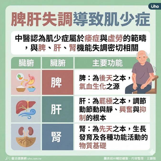 中醫認為肌少症與脾、肝、腎機能失調有關,可透過健脾益氣、補益肝腎等方式治療。
