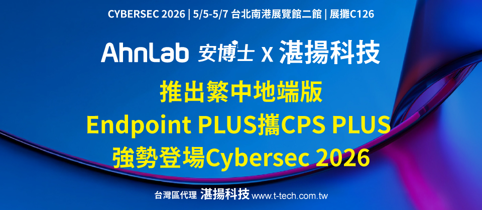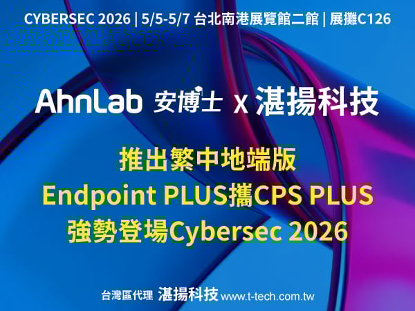 AhnLab 將於5月5日至7日Cybersec資安大會期間,攜手台灣總代理湛揚科技共同展示 AhnLab Endpoint PLUS與CPS PLUS。CPS PLUS 專注於OT工控場域防護,透過EPS白名單機制有效攔截威脅,確保產線穩定運作不中斷。展會期間,原廠專業團隊與代理商技術人員將於現場進行產品解說與展示,並規劃整點「安博士小學堂」活動及精美贈品,讓參訪者深入體驗 AhnLab 的核心技術與產品優勢。誠摯邀請企業客戶與合作夥伴蒞臨南港展覽館二館展位C126親身感受AhnLab整合OT與IT的資安防護實力。更多資訊請參閱湛揚科技官網 www.t-tech.com.tw或電洽02-2515-1585,將有專人為您服務。歡迎下載符合PDPA及SEMI E187E188的產品資訊,了解AhnLab產品的導入與應用。(照片記者 沁諠翻攝)