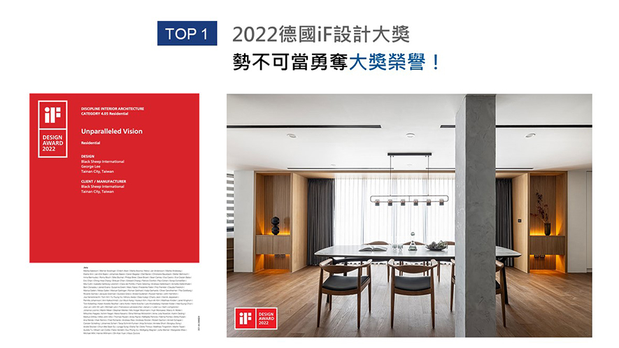 世界四大設計獎之一的德國 iF 設計大獎(iF DESIGN AWARD),自1954 年創辦至今已擁有超過60 年的悠久歷史,在國際間具有指標性及前瞻性。喬治黑羊設計 李家齊 設計師,於設計住宅作品《透・景》 時,以「創造空間對話」為理念,活絡家宅的自在樣貌與彈性機能,其中對美學與質感的高度追求,獲得2022德國iF設計大賽評審們的大力推崇,最終拿下「iF設計大獎」!