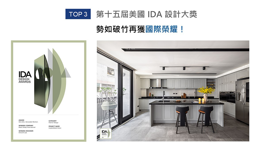 美國IDA 國際設計大獎(International Design Awards),旨在表彰「設立新標準」與「突破室內設計界限」、「改變人們生活和工作空間」的優秀設計師及團隊。喬治黑羊設計 李家齊 設計師 於作品《透・景》中,遵循「形隨機能」的設計法則,劃設出自然流暢的動線與格局,打造符合一家人居住的宅邸,獲得2021 IDA Design Awards「Honorable