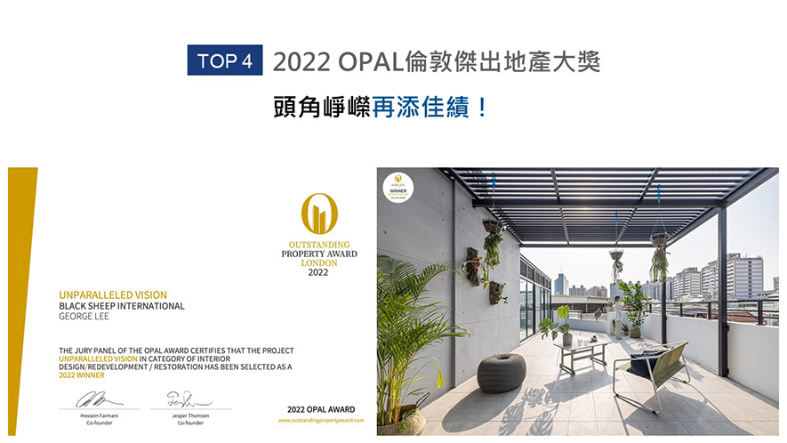 OUTSTANDING PROPERTY AWARD LONDON,OPAL(英國倫敦傑出地產大獎),力求各地最富創造力、社會影響力與永續性的設計方案。喬治黑羊設計 李家齊 設計師 於家宅作品《透・景》中,透過深沉穩重的黑與溫潤質樸的木質,形塑細膩質感,並回應業主對開放場域的期盼,屏除室內隔間,巧劃寬敞舒適的大氣格局,獲得2022 OPAL倫敦傑出地產大獎「Winner」獎項,續寫品牌榮耀!