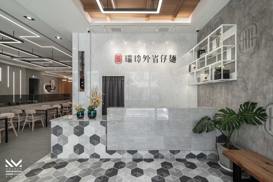 ▲接待區鋪陳復古的六角磚並向上延伸至櫃檯,另疊加紋路細緻的大理石材,搭配一旁俐落的鐵件層架與別具一格的造型logo牆,為延續二十多年的傳統美味添入新氣象。