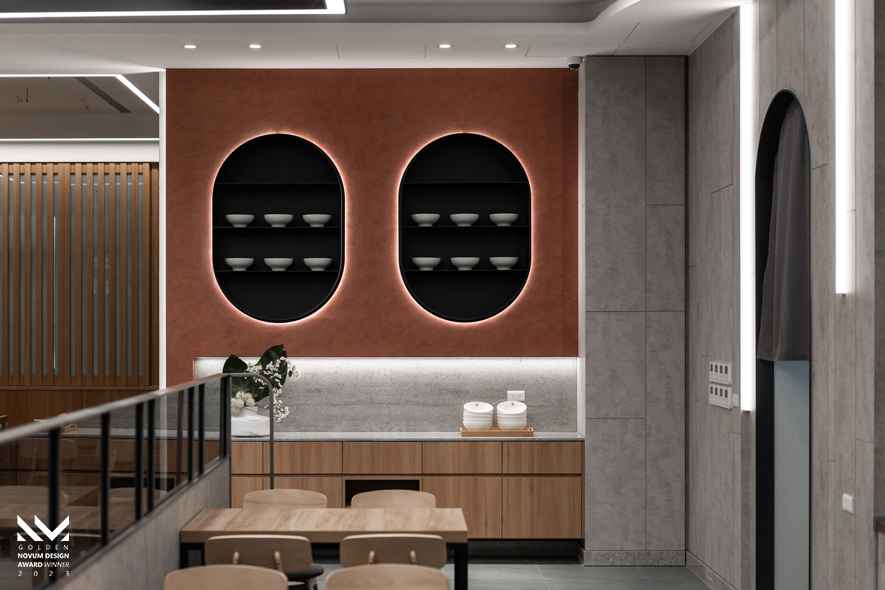 ▲醬料區以搶眼的磚紅色漆料為基底,除了傳遞業主數十年如一日的熱忱,也具引導顧客之效,牆面結合招牌logo的橢圓圖形,設計兩道置入間接照明的壁龕,內部擺設店家的特製麵碗,令此處成為空間的視覺焦點。