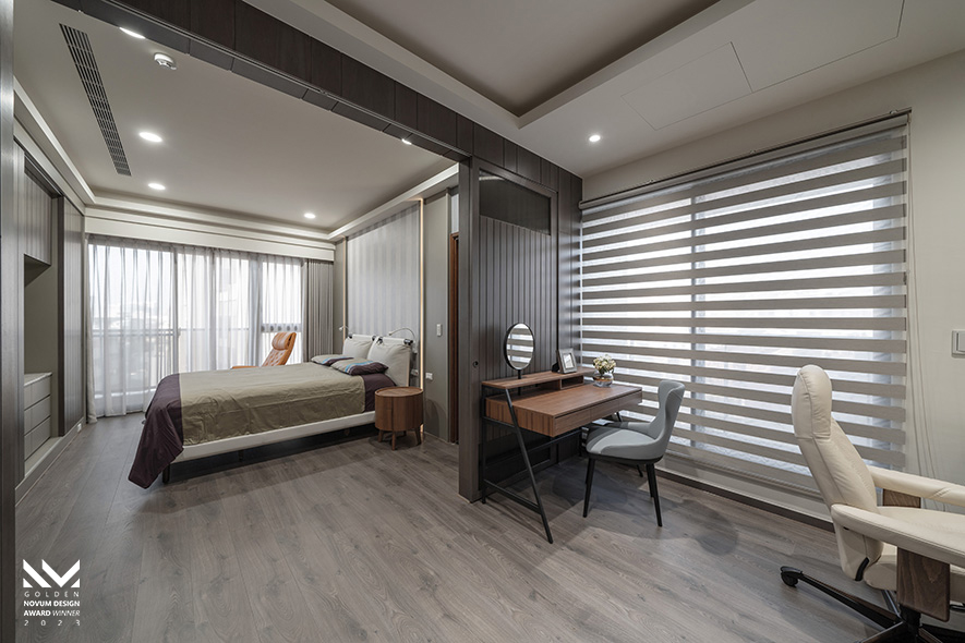▲主臥鋪設超耐磨木地板,搭配深色調及鵝黃光源,營造沉穩溫暖的空間氛圍,另規劃一處更衣間兼工作室,內部設置書桌及衣櫃,並妝飾水墨樹影的夾膜玻璃,提升視覺豐富度。
