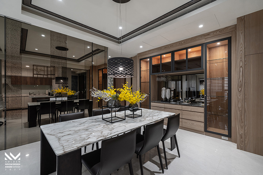▲餐廳選用木質餐櫥櫃,替場域增添溫潤暖意;廚房對側規劃複合茶鏡及仿古鏡的滑門,豐富立面層次,中央則置入業主挑選的石紋餐桌,搭配黑色皮革餐椅,營造俐落不失溫馨的用餐環境。