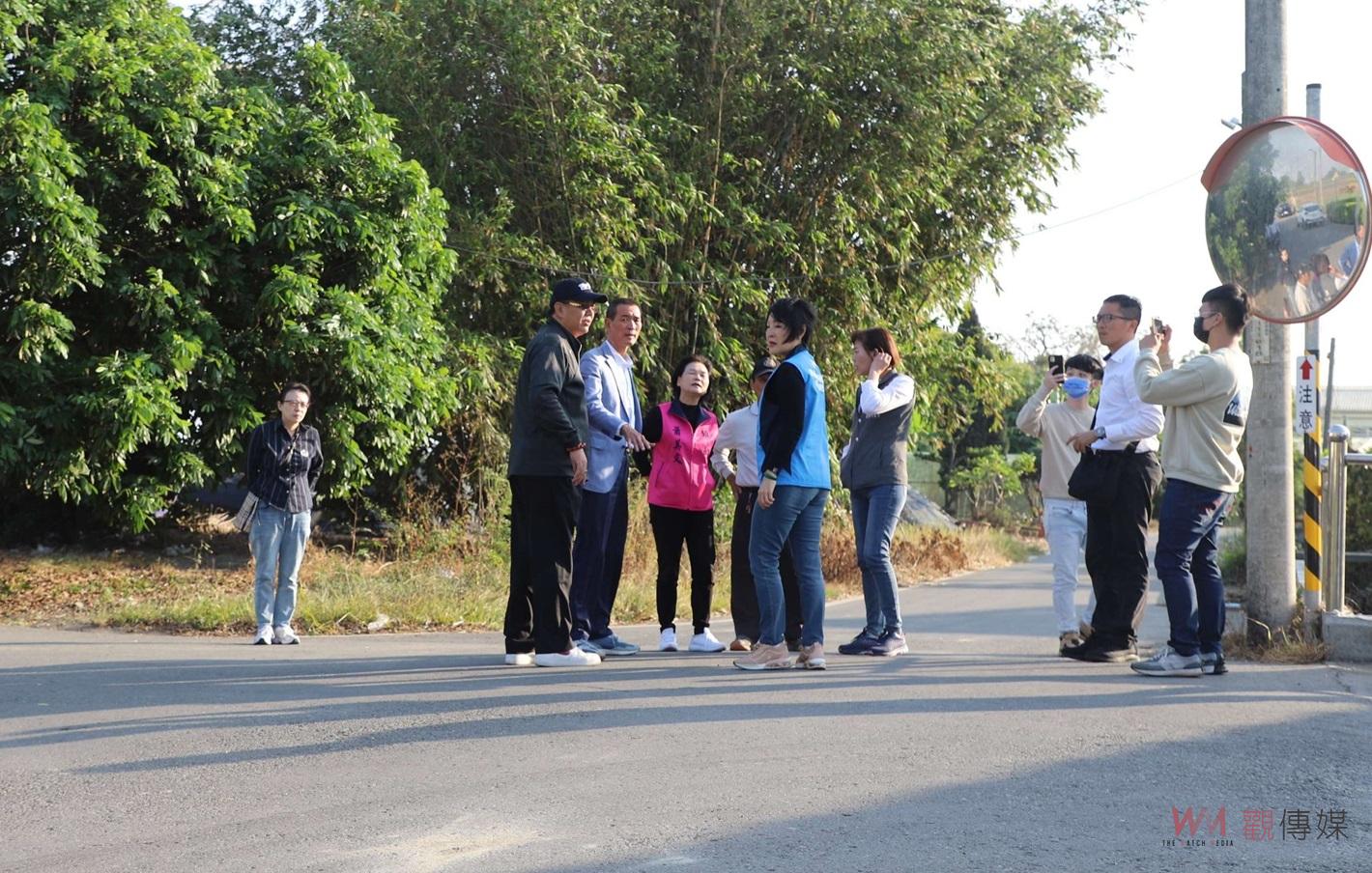 ▲縣長張麗善、處長汪令堯、副議長蔡咏锝、鎮長蕭美文等人會勘雲164線往東延伸至府番里、往西延伸至劉厝里,是鎮民不可或缺的重要道路。