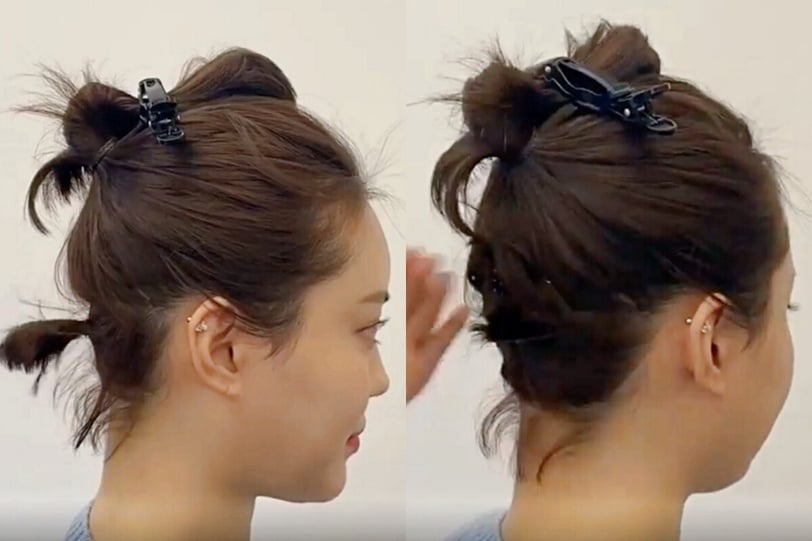 綁完後,先把馬尾往上夾起固定,再把後面落下的髮絲往上梳、將頭髮用髮圈綁起固定。最後再用小黑夾將髮束往上夾進後腦勺髮根處即可,也可以再太短、綁不起來的碎髪以同樣的方式用黑夾收進去。