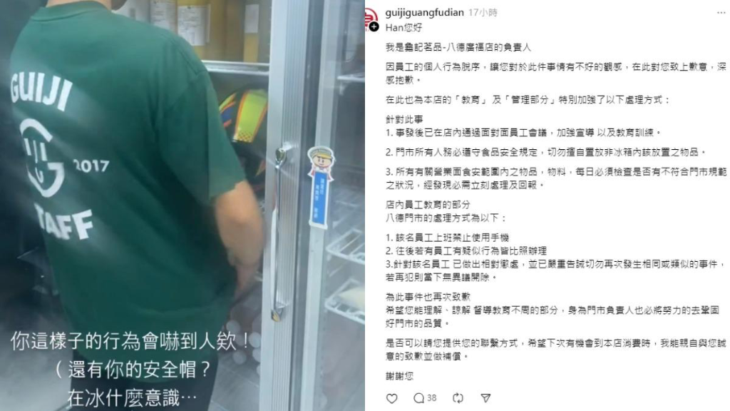 對此,龜記茗品「八德廣福店」也在貼文下發聲明回應,因員工的個人行為脫序,讓您對於此件事情有不好的觀感,在此對您致上歉意,深感抱歉。在此也為本店的「教育」 及「管理部分」特別加強了以下處理方式:針對此事 1. 事發後已在店內通過面對面員工會議,加強宣導以及教育訓練。2. 門市所有人務必遵守食品安全規定,切勿擅自置放非冰箱內該放置之物品。3. 所有有關營業面食安範圍內之物品,物料,每日必須檢查是否有不符合門市規範之狀況,經發現必需立刻處理及回報。