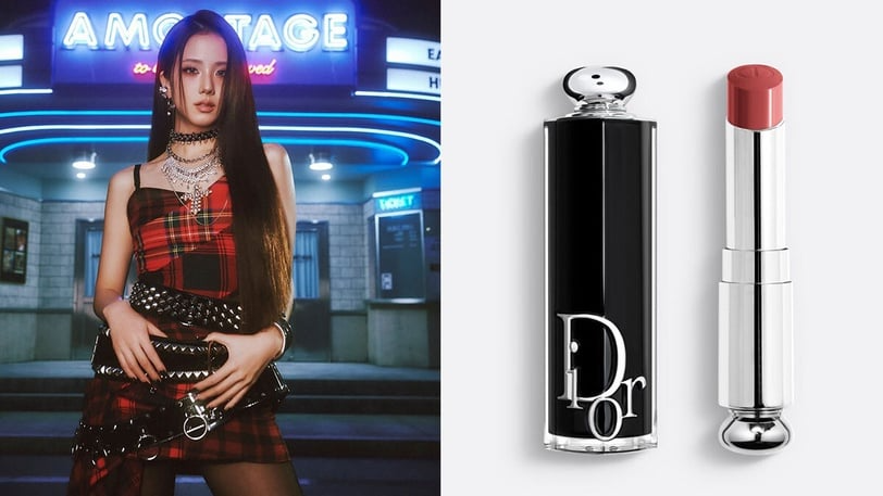 Jisoo第二套造型則是龐克風格,妝容上以裸色調結合深邃眼妝,呈現帥氣酷感,同時又能很好展現出Jisoo天生的乾淨甜美氣質,唇色使用癮誘唇膏#558粉棕玫瑰,在柔和裸色中透出淡淡粉色,展現低調而不失個性的唇色,完美呼應整體帥氣風格。