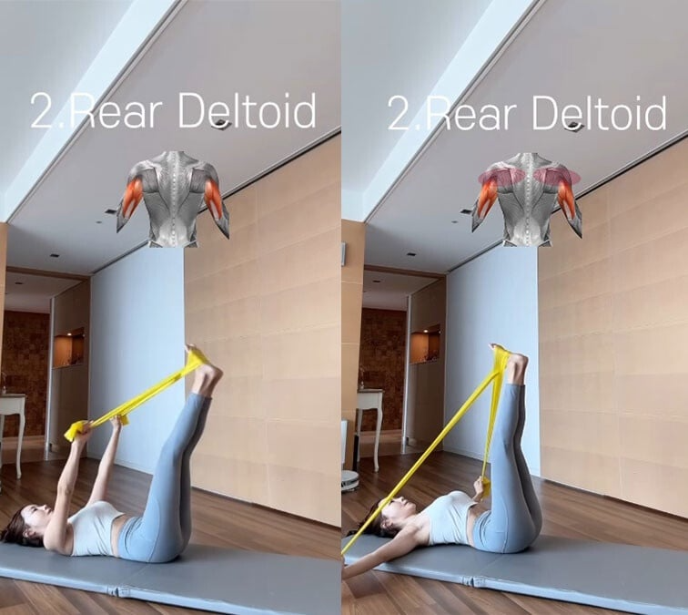 背部肌肉不如想像中好鍛鍊!不妨透過彈力帶、躺姿與雙腳的高度來做到,躺下後將彈力帶交疊於腳掌,接著雙手向地面打開,會感受到後背與肩膀肌肉的發力,以及雙腿後側的伸展。