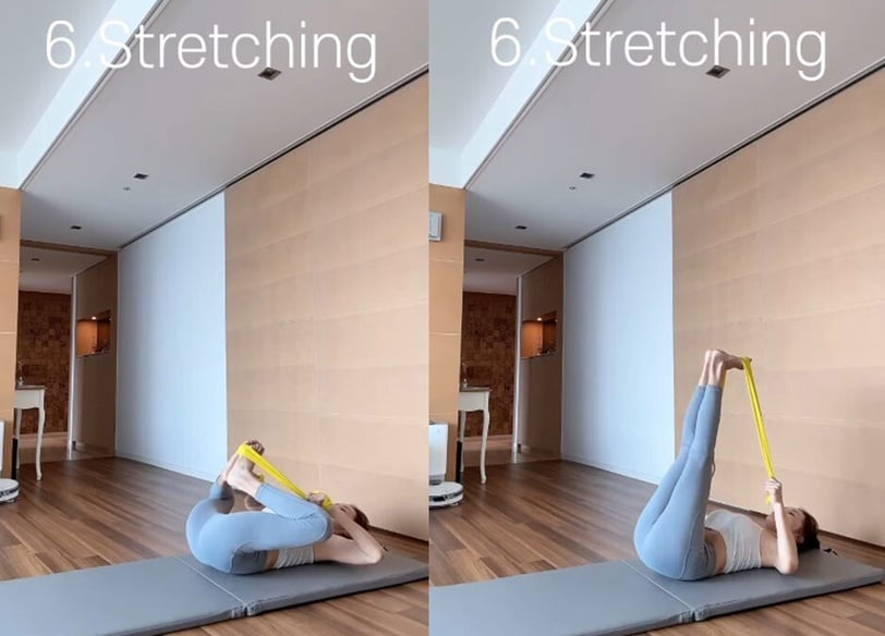 最後就是收操!利用彈力帶做腿部的伸展,須注意的是,雙手拉住彈力帶時,請確保頭部與上半身有「貼在」地上,沒有被拉起來,才能達到最好的效果。