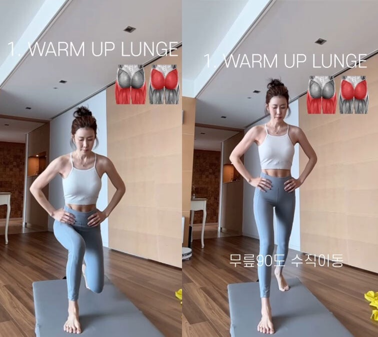 作為開場與暖身,做弓箭步時需要注意,要記得去感受發力部位在「臀部&大腿」!上半身站直、站挺、縮小腹,接雙手插腰,慢慢向下屈膝弓箭步,膝蓋呈現90度且不超過腳尖。