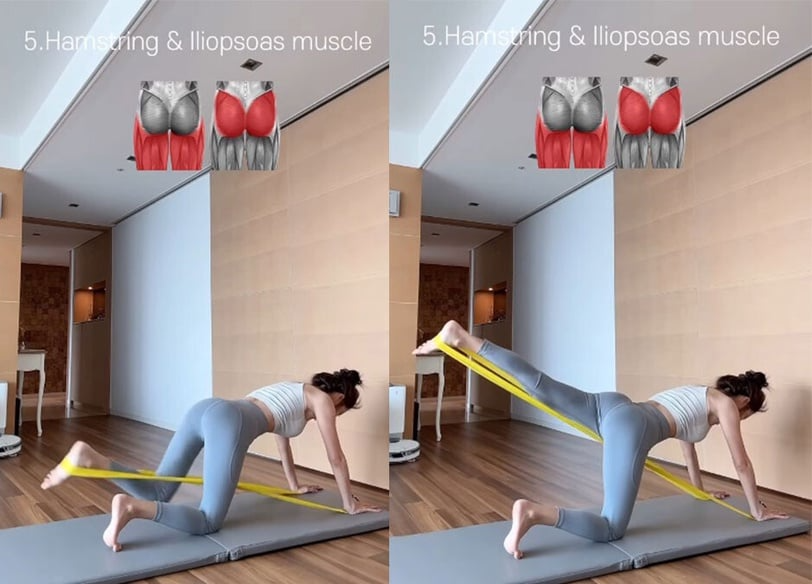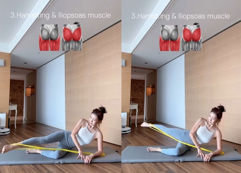 側邊抬腿特別能改善假胯寬、大腿外側馬鞍肉以及不夠圓潤的臀型!建議用手壓著彈力帶,且上半身保持挺直、不動,接著彈力帶勾在腳踝處,由前而後做側抬腿,會感受到肌肉發力更有感,有效提升鍛鍊效果。