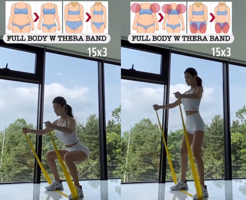 彈力帶與深蹲結合,肩膀與臀部一次練到!雙腳與肩同寬,腳踩彈力帶,雙手各抓一端,用來確保深蹲時,雙手間的距離不變,以達到最佳訓練效果。一組15下,共作3組。