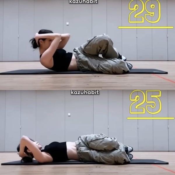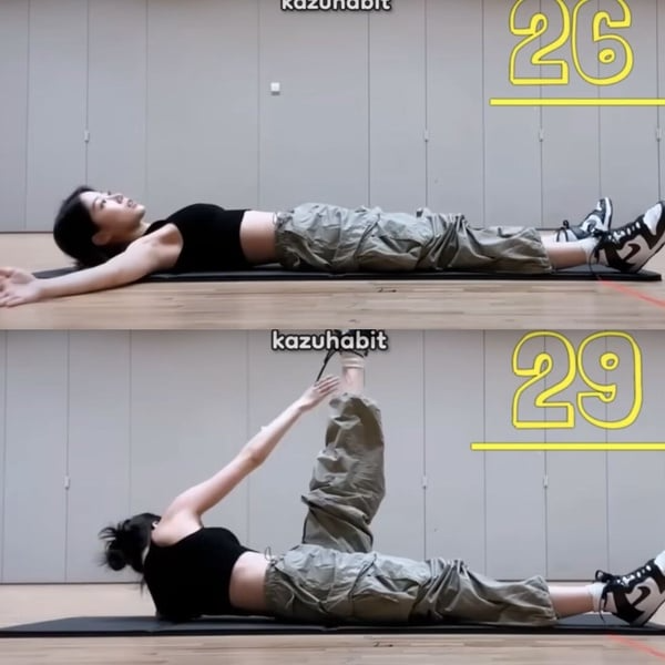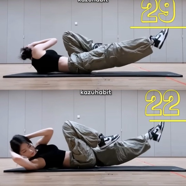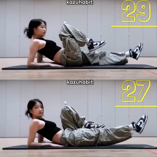 躺好後,雙手抱在後腦勺,接著先雙腳屈膝倒在一側,接著想像要用手指碰到膝蓋,腹部發力將身體帶起來,撐個一兩秒再躺下休息,用來鍛鍊側腰與腹肌線條。這個動作需注意,出力的地方是腹部、避免抱頭的手過度發力,才能有更好的鍛煉效果。