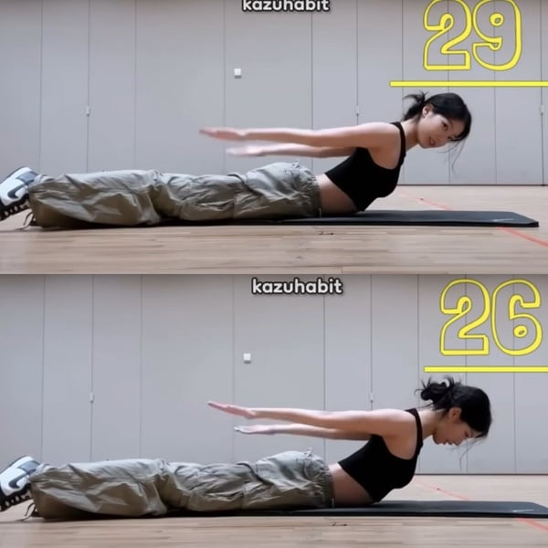 最後以超人畫圈收尾!趴下後,用核心力量將上半身挺起來,並注意肩頸不須過度用力,眼睛直視前方或地面,確保整個背部是呈直線。接著手臂伸直向後繞圈,不僅瘦小腹,也緊緻手臂線條。