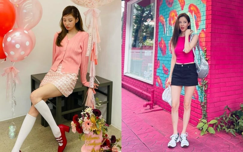 徐玄很擅長運用色彩來營造氛圍感,其中最讓人印象深刻的,就是她常用粉色系單品來提升整體甜度,但又拿捏得恰到好處,不會過於甜膩。她會選擇霧粉、裸粉、奶油粉這類低飽和色調,搭配簡約洋裝、牛仔褲,溫柔又高級。建議女孩可以學徐玄利用黑跟粉的搭配去營造出視覺對比,在優雅中加入一點氣場,既不失少女感,也讓風格更有個性層次。